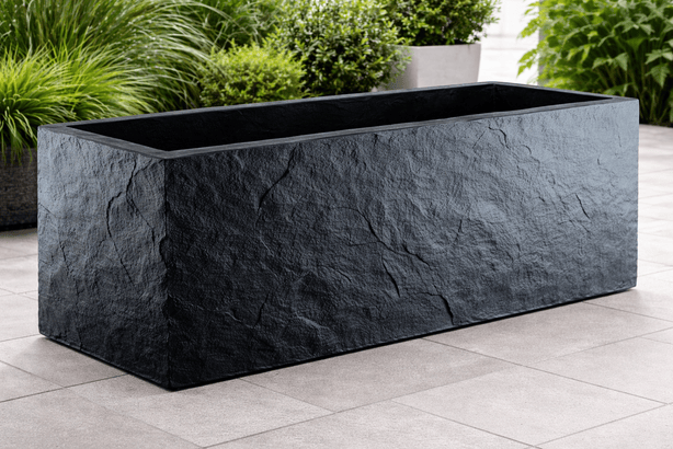 The surface features a realistic hand-crafted stone texture, giving it an earthy, organic appeal while remaining weather-resistant, crack-proof, and easy to maintain. Its clean rectangular form makes it ideal for balconies, terraces, hotel lobbies, gardens, walkways, and commercial landscapes.