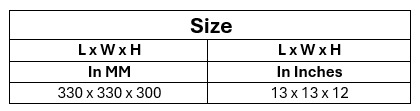 600 x 230 x 230 mm (24 × 9 × 9 Inches), 600 x 300 x 300 mm (24 × 12 × 12 Inches), 750x750x750 mm (30x30x30 Inches), 900x900x900 mm (36x36x36 Inches)